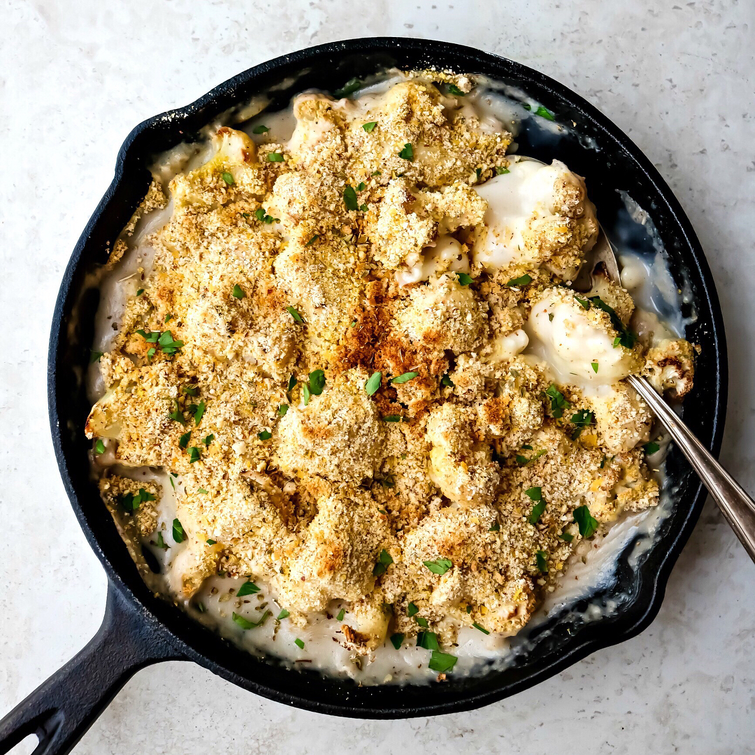 A creamy and soothing gratin is ideal for warming up your party table. This recipe calls for ham, but you can easily skip it to make the dish vegetarian. Vegans, however, are not allowed – there is plenty of thick cream as well as butter, whole milk and crumbled goat’s cheese to create that fulfilling wealth. Cauliflower cooked in oven-baked dairy sauce until melted, while a crumb coating adds some texture and crispness. You cook the casserole, which is uncovered in the last 20 minutes, so that the casserole is brown, which is essential for a good gratin!